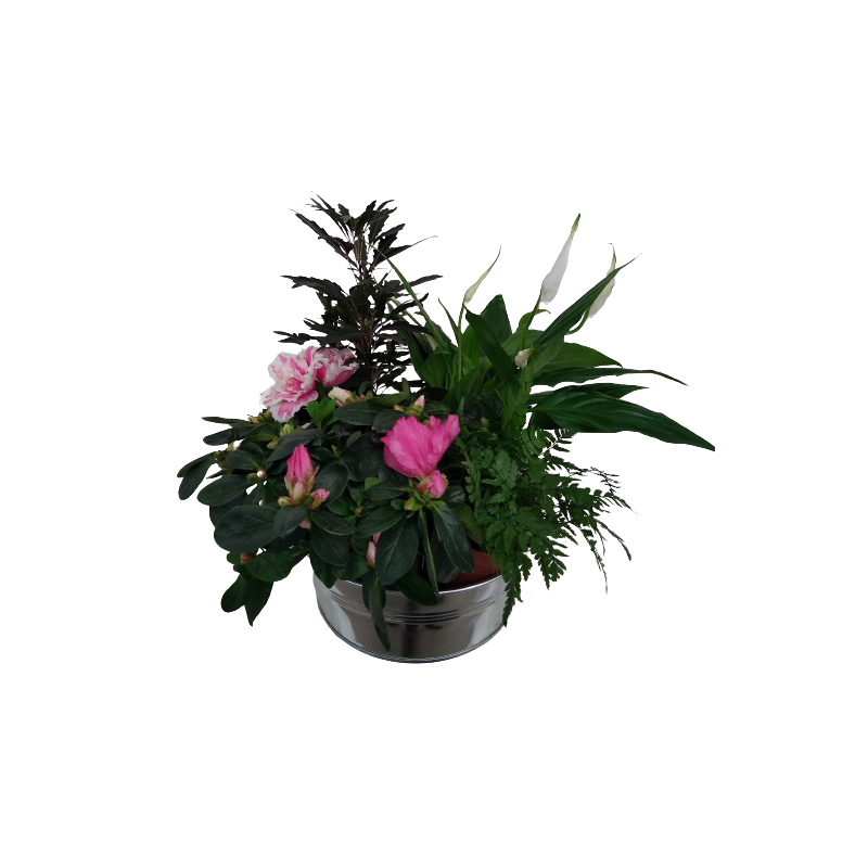 Composition intérieur bassine zinc 20 cm Plante verte / spathiphyllum / azalée / fougère