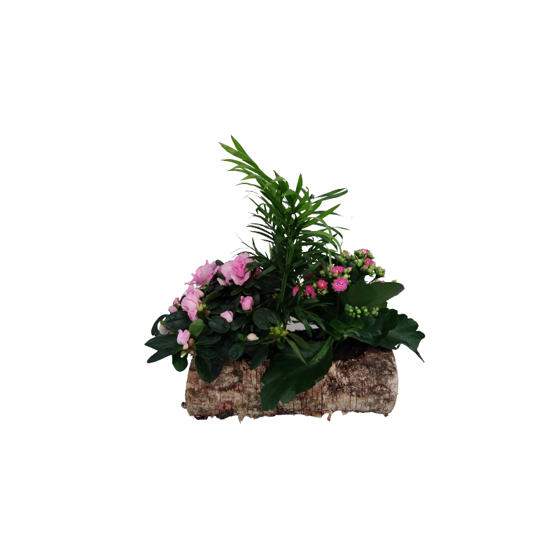 Composition intérieure bûche 30 cm Azalée / Areca / Kalanchoe