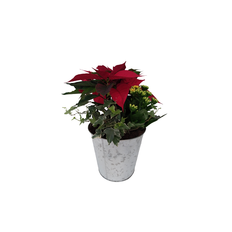 Composition intérieure cache pot zinc 17 cm Poinsettia 10.5 / lierre 9 / kalanchoe 10.5