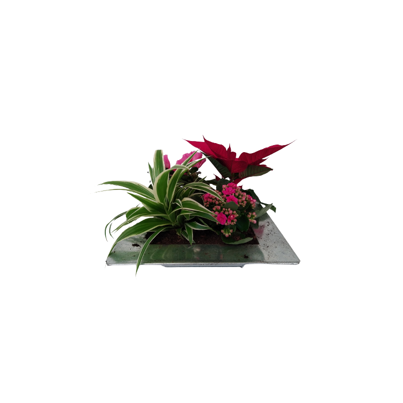 Composition intérieure plateau zinc carré 25 x 25 cm Chloro 9 / Kalanchoe micro / azalée micro / poinsettia micro