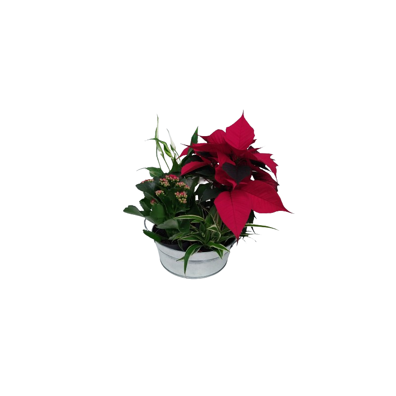 Composition intérieure bassine zinc 20 cm Spathi 9 / Poinsettia 10 / Chloro 9 / Kalanchoe 10