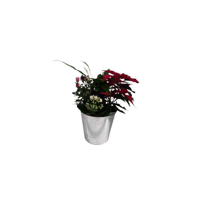 Composition intérieure cache pot zinc 17 cm avec Spathiphyllum 9 / Rosier 7 / Poinsettia 10 / Kalanchoe 7