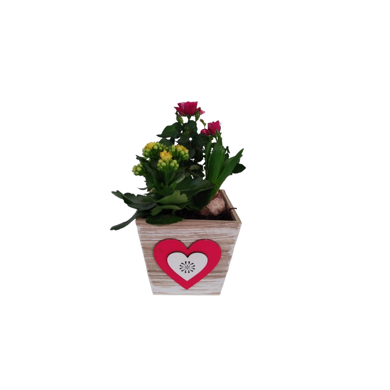 Composition intérieur cache pot bois avec coeur Rosier 7 / kalanchoe 7 / jacinthe
