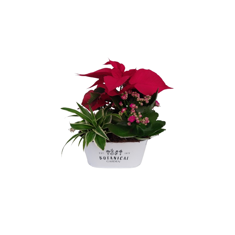 Composition intérieure jardinière zinc blanche 24 cm avec Poinsettia 10 / chlorophytum 9 / kalanchoe 10