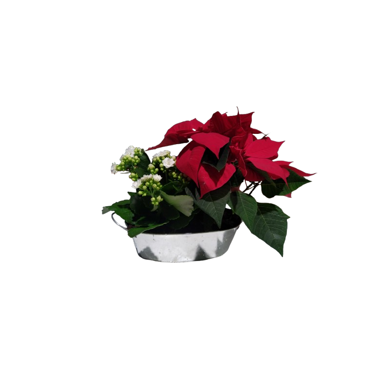 Composition intérieure Jardinière zinc ovale 25 X 13.5 cm avec Poinsettia 10 / Kalanchoe 10