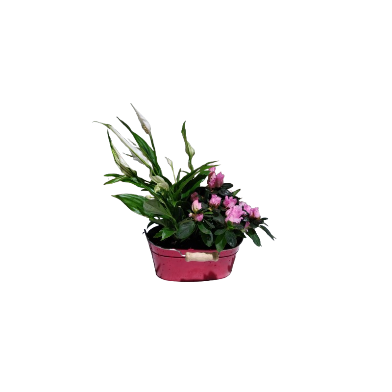Composition intérieure Jardinière zinc rouge 20 X 11 cm avec spathiphyllum 9 / Azalée 10