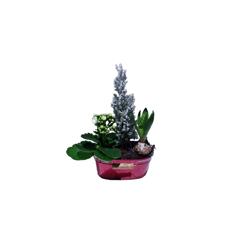 Composition intérieure Jardinière zinc rouge 20 cm avec Sapin neige 9 / Kalanchoe 8 / Jacinthe godet *TVA20%