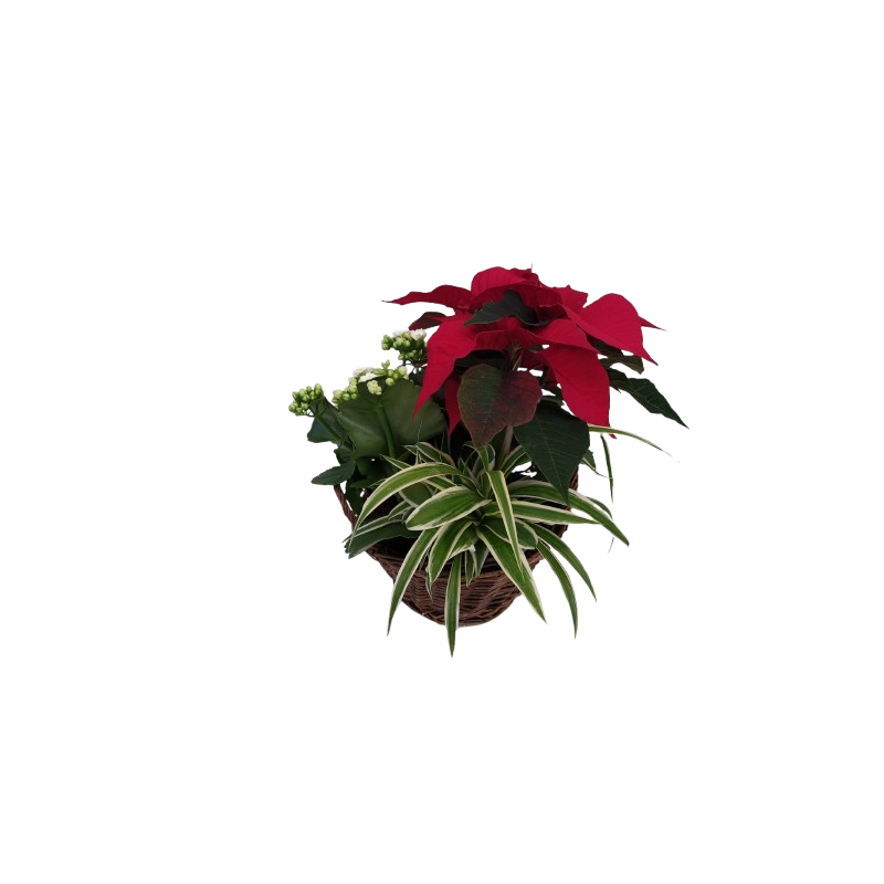Composition intérieure Panier osier 20 cm avec Poinsettia 10 /Kalanchoe 10/ Chlorophytum 9