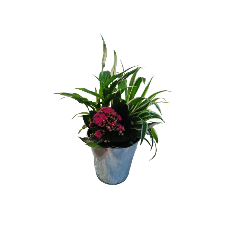 Composition intérieure cache pot zinc 13 cm avec Spathiphyllum 7 / Chlorophytum 9 / kalanchoe 6-7